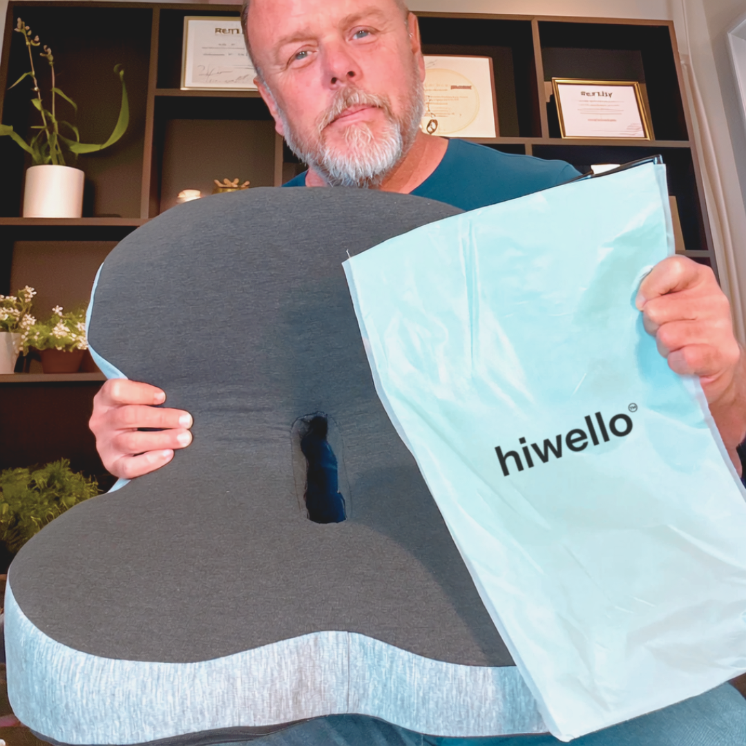 Hiwello är ergonomiskt utformad för att varsamt lyfta dina höfter, minska trycket på känsliga nerver och förbättra hållningen – så att du kan sitta längre, bekvämt.